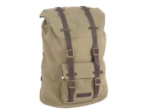 Plecak typu "kostka" wykonany z brezentu bawełnianego w kolorze khaki. Kieszeń zewnętrzna zamykana za pomocą pasków ze sprzączką oraz dodatkowo zamkiem błyskawicznym.