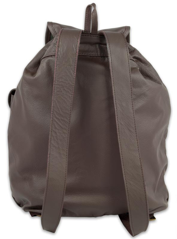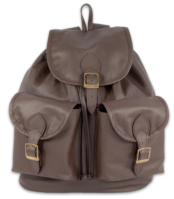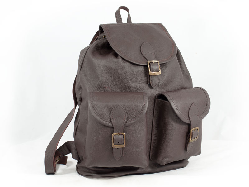 Plecak wykonany z wysokiej jakości miękkiej skóry w kolorze ciemnobrązowym. Posiada dwie zewnętrzne kieszenie zamykane klapkami.