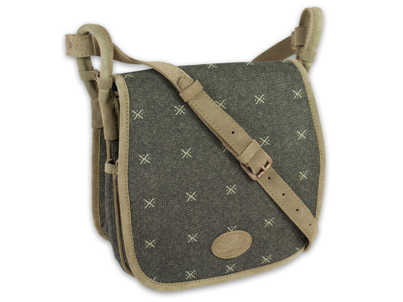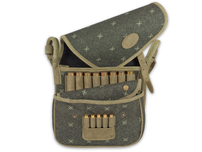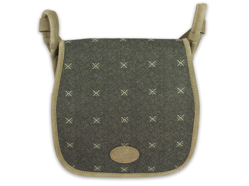 Torebka myśliwska wykonana z tkaniny bawełnianej podklejonej materiałem wodoodpornym. Wewnątrz wyłożona włókniną w kolorze ciemno szarym, nadającą klapie odpowiednią sztywność. Obszycia ze skóry welurowej w kolorze oliwkowym.