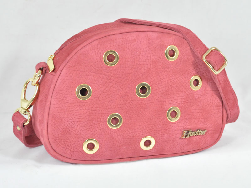 Torebka wykonana z aksamitnej w dotyku skóry nubukowej, w kolorze malinowym. Na przedniej ściance torebki umieszczone są złote oczka stanowiące element ozdobny.
