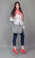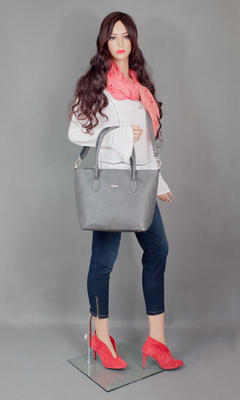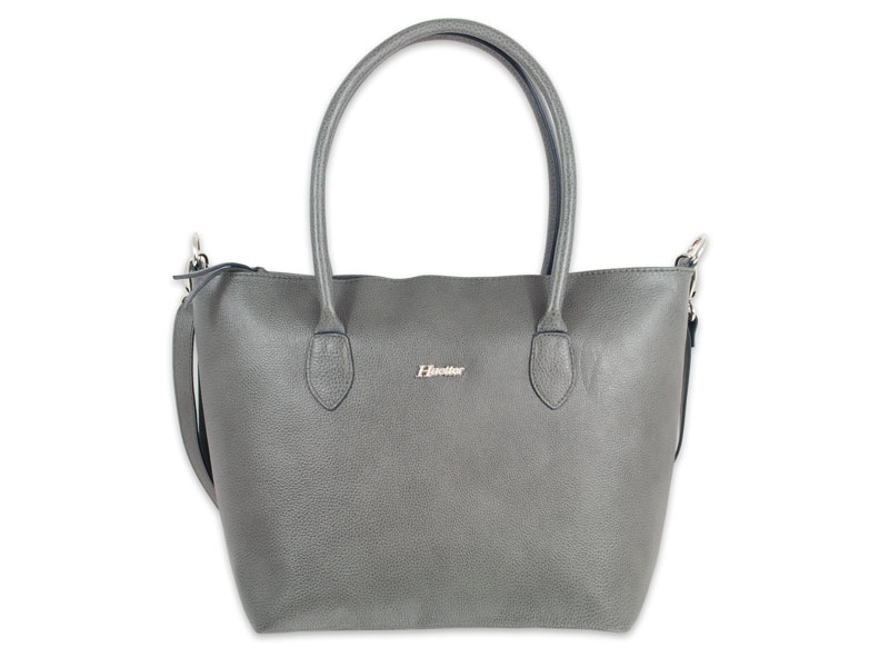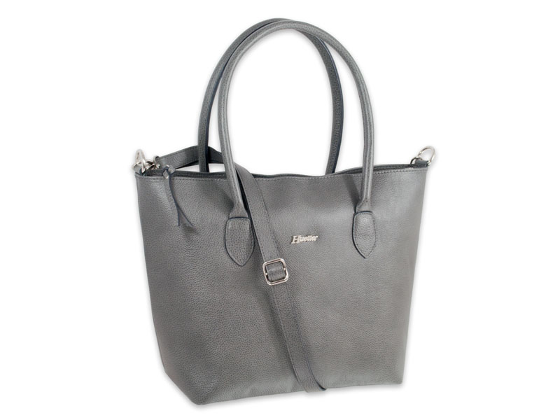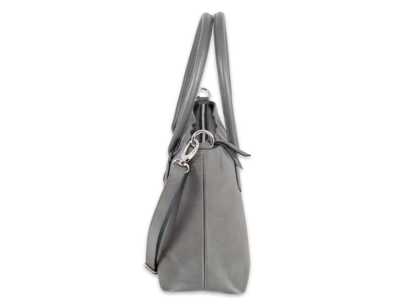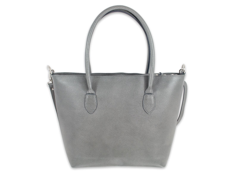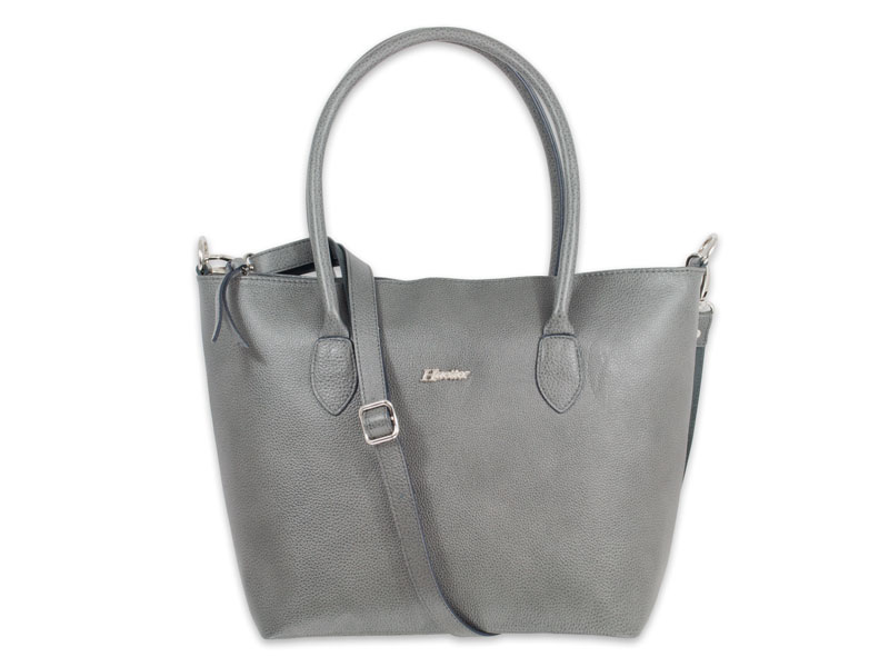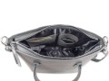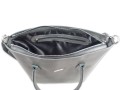 Torebka typu tote, wykonana z miękkiej skóry w kolorze szarym. Dno w kształcie prostokąta o zwiększa pojemność użytkową torebki.