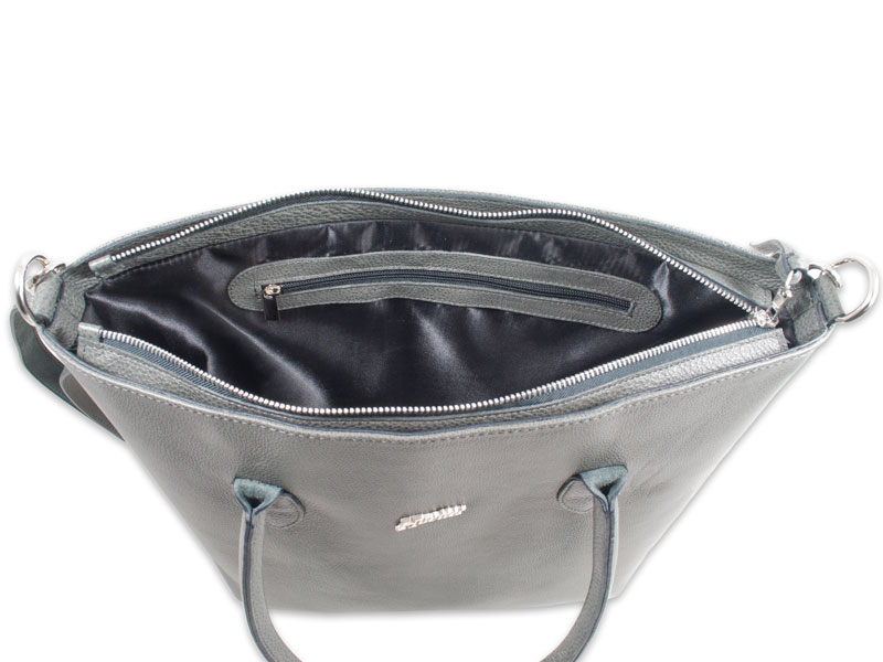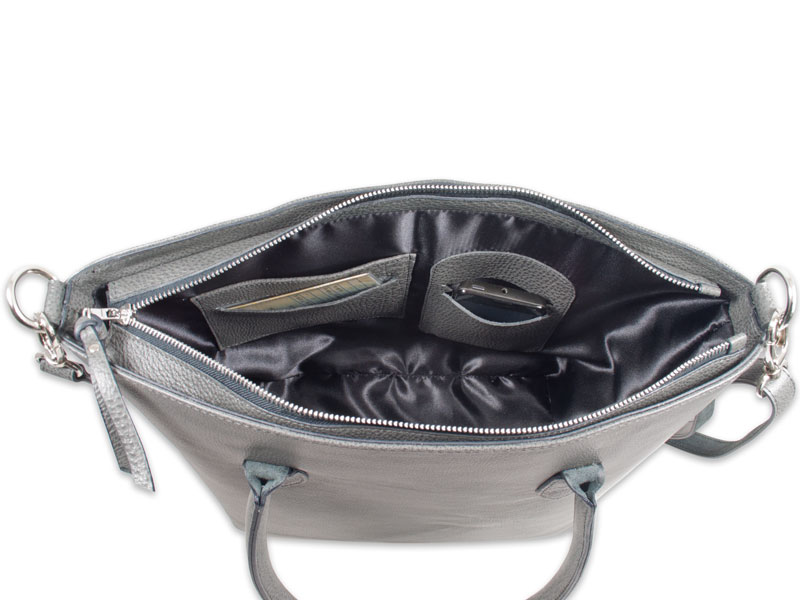 Wnętrze torebki wyłożone jest wysokiej jakości tkaniną podszewkową. Na jednej ze ścianek przegrody znajduje się skórzany moduł zaprojektowany do przechowywania dokumentów oraz smartfona, na drugiej kieszonka zasuwana zamkiem błyskawicznym.