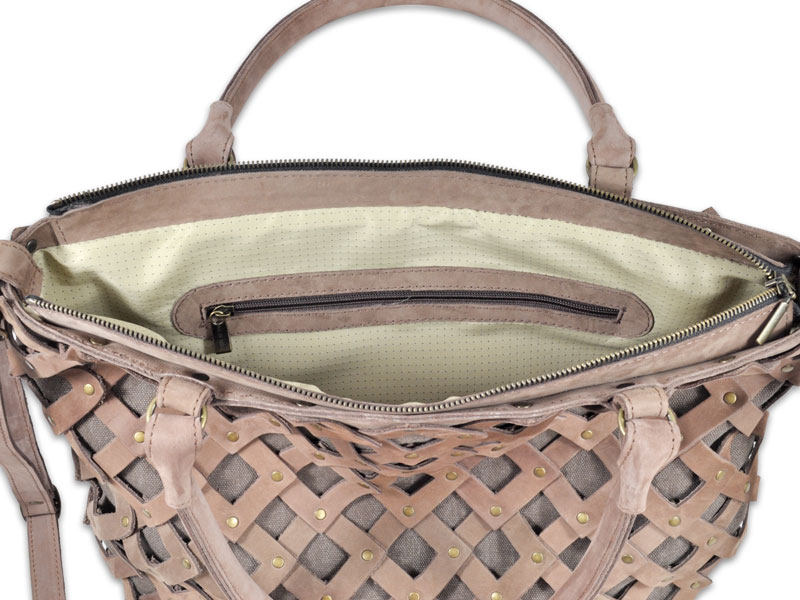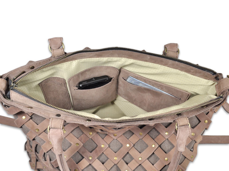 Wnętrze torebki wyłożone jest wysokiej jakości tkaniną podszewkową w kolorze kremowym. Na jednej ze ścianek we wnętrzu, znajdują się skórzane moduły zaprojektowane do przechowywania dokumentów, smartfona, kluczy itp. Na drugiej, kieszonka zasuwana zamkiem błyskawicznym (patrz zdjęcia 5 i 6).