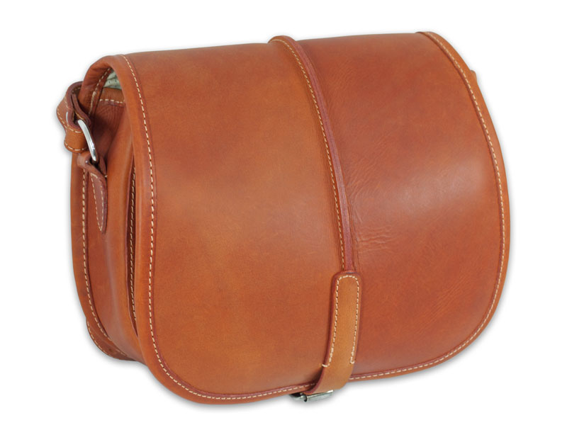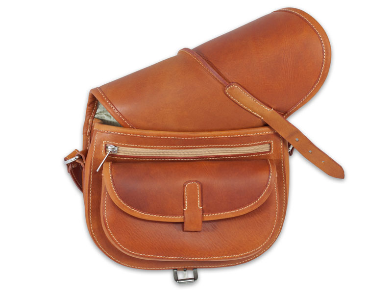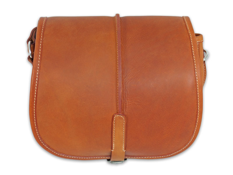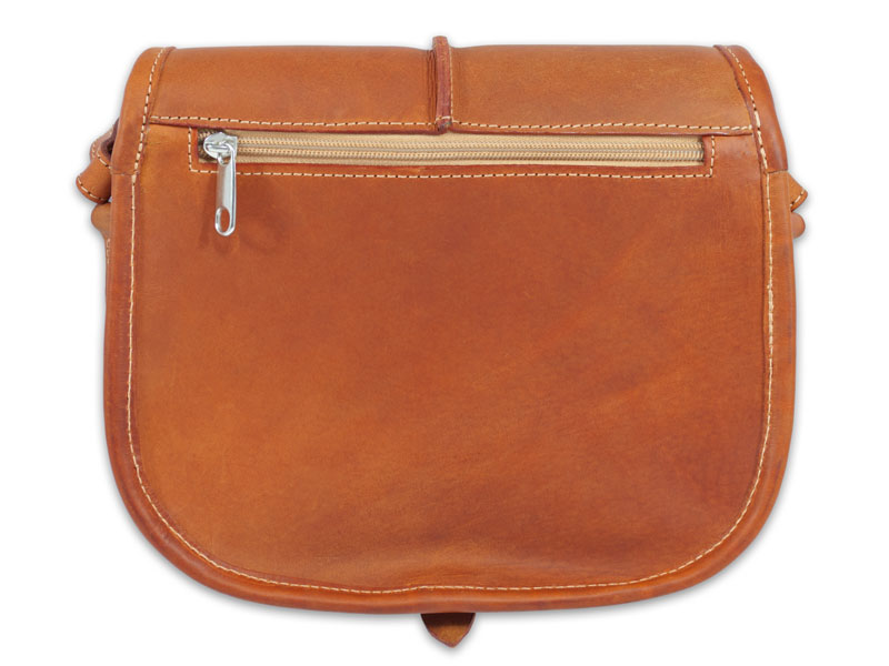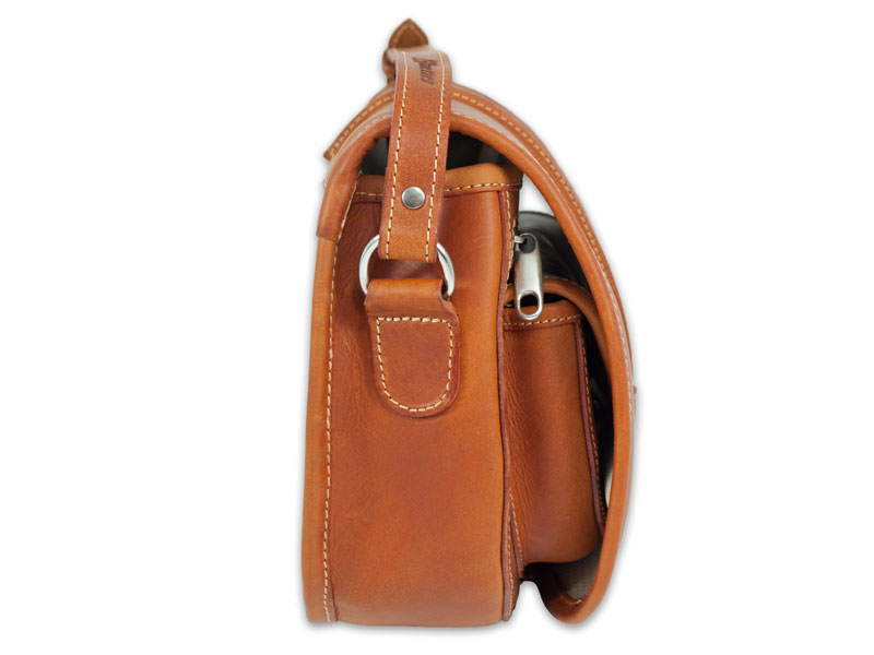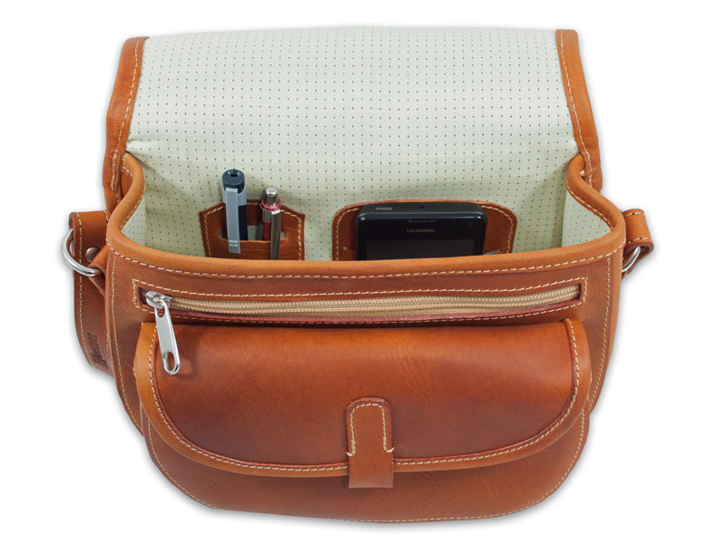 Z tyłu oraz pod klapką dwie dodatkowe zasuwane kieszenie na dokumenty. Skórzany pasek nośny posiada możliwość regulacji długości.