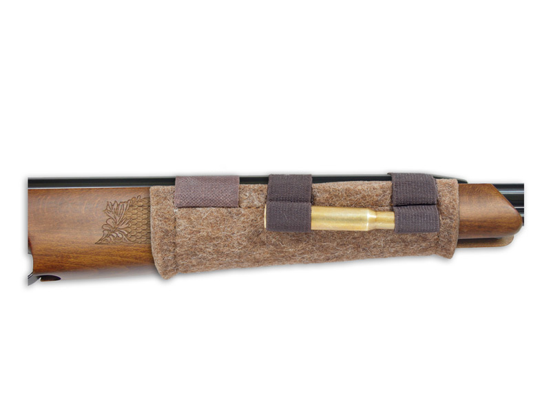 Wykonany z grubego filcu uchwyt chroniący łoże broni przed zarysowaniem. Mocowany do broni za pomocą gumowych taśm. Dodatkowo wyposażony w fałdy gumowe umożliwiające przenoszenie do 4 szt. amunicji.