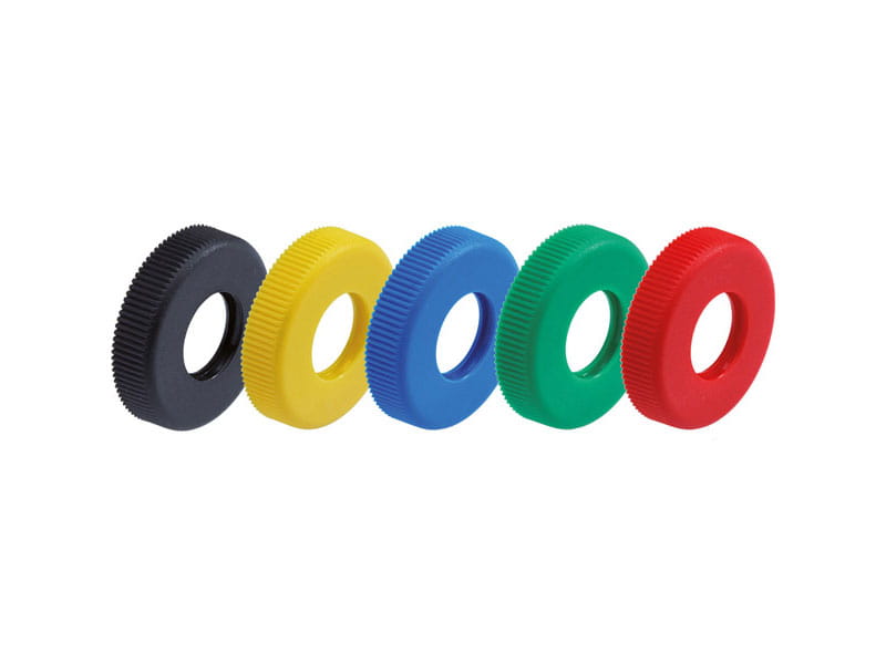 - 5 external push-fit rubber rings which attach to the knurled ring in: red, yellow, green, blue and black